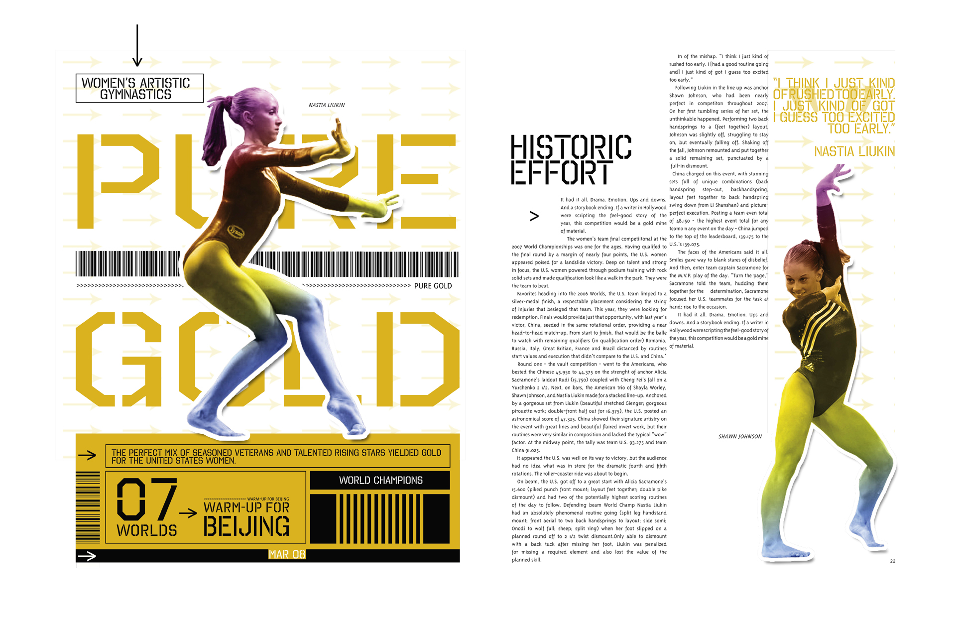 The use of barcodes, arrows, and stencil-like typography represents the technicalityof gymnastics. This is also communicated through the cutout and color of the images.