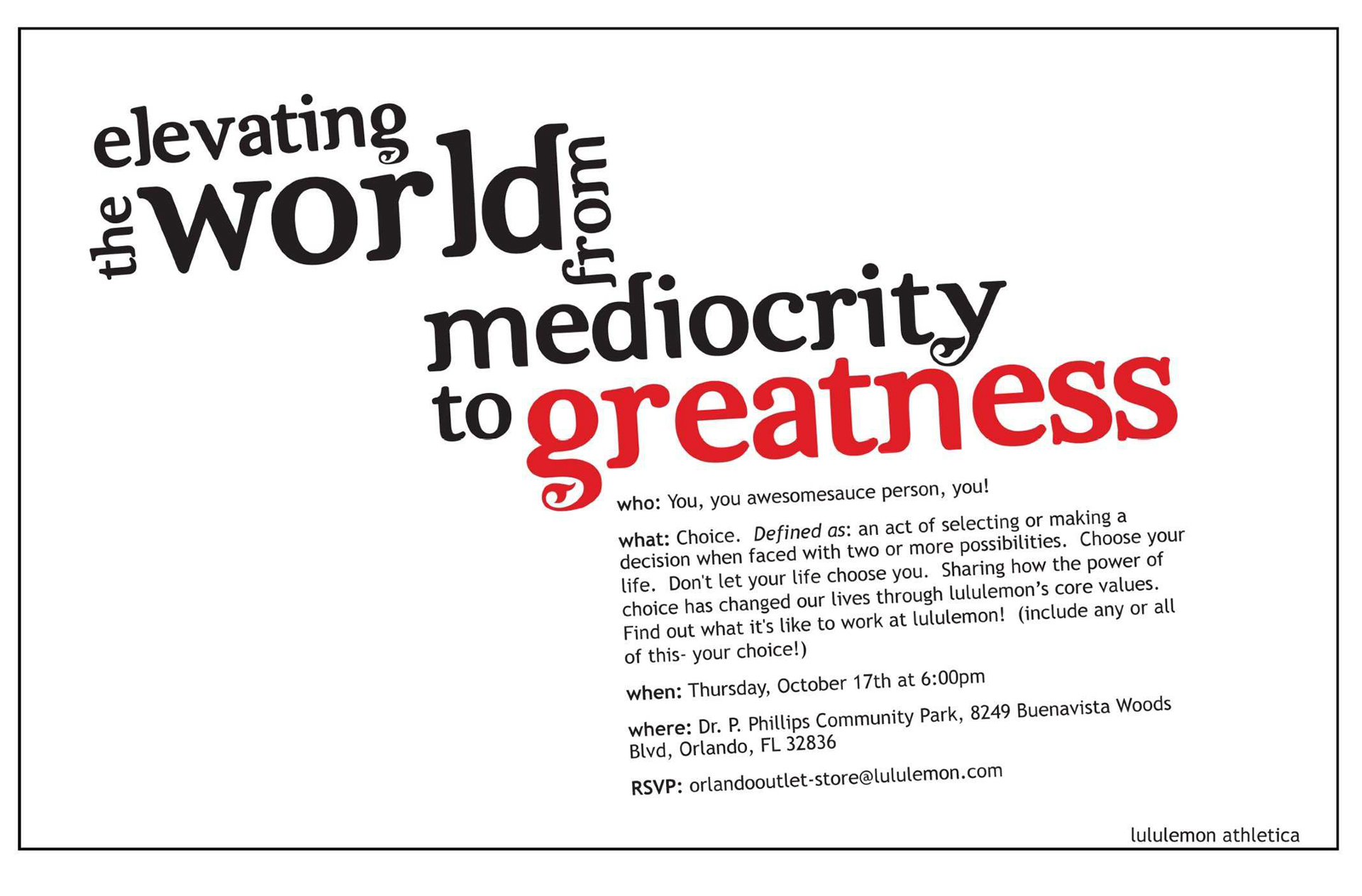 Lululemon Athletica is a high performance athletic wear store. A fllyer was needed for an event that they were hosting locally.