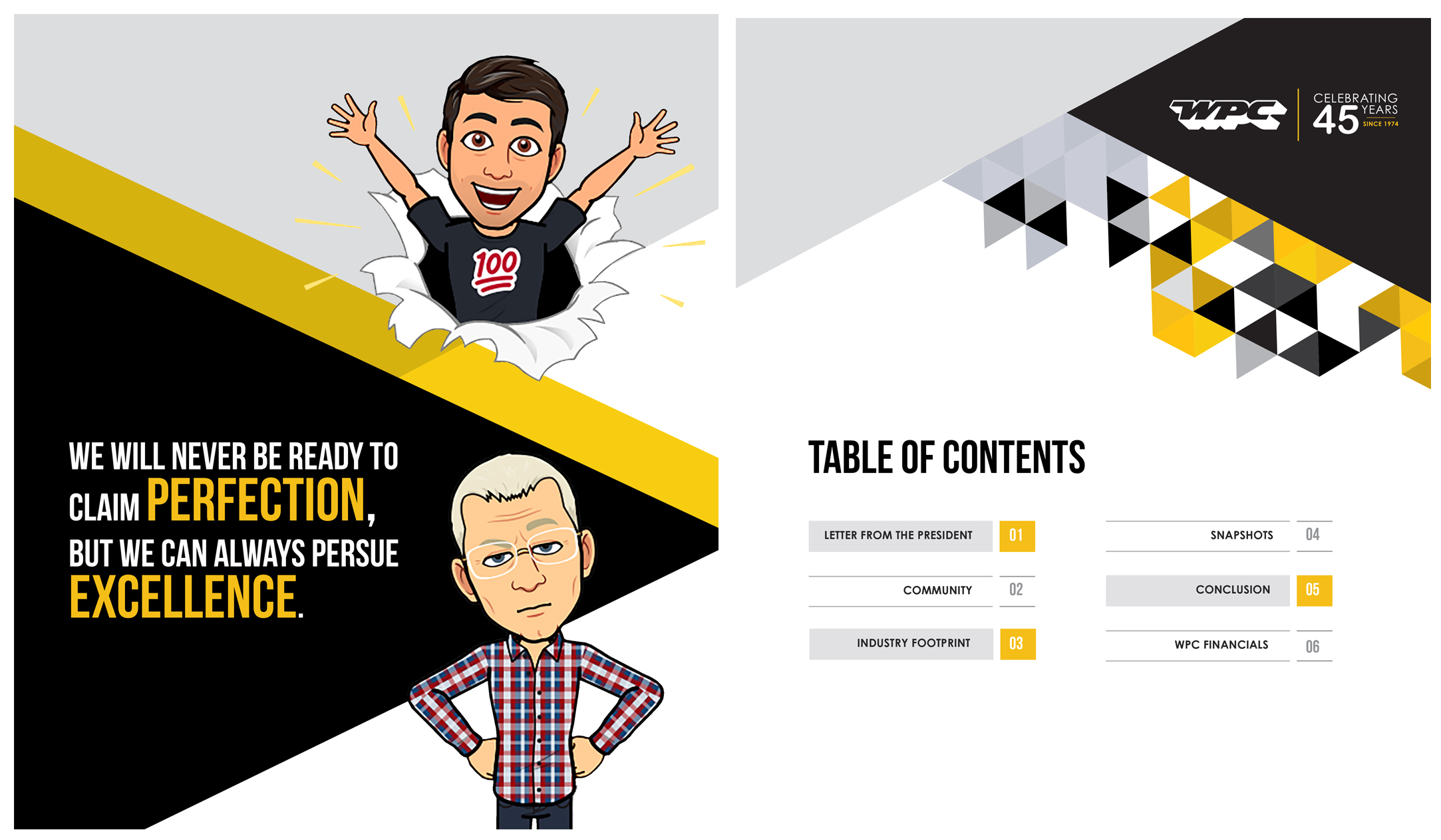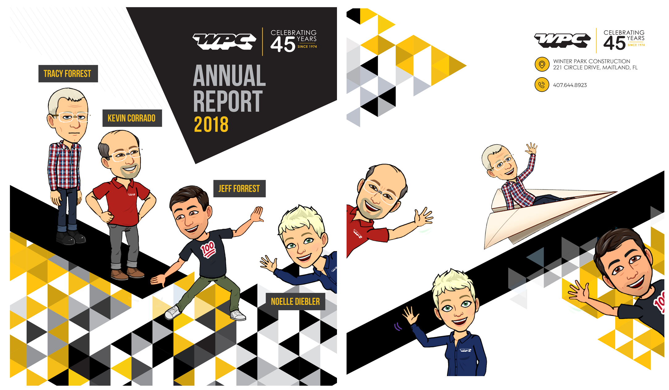 A humorous annual report design with created the Partners into their own personal Bitmoji's.
